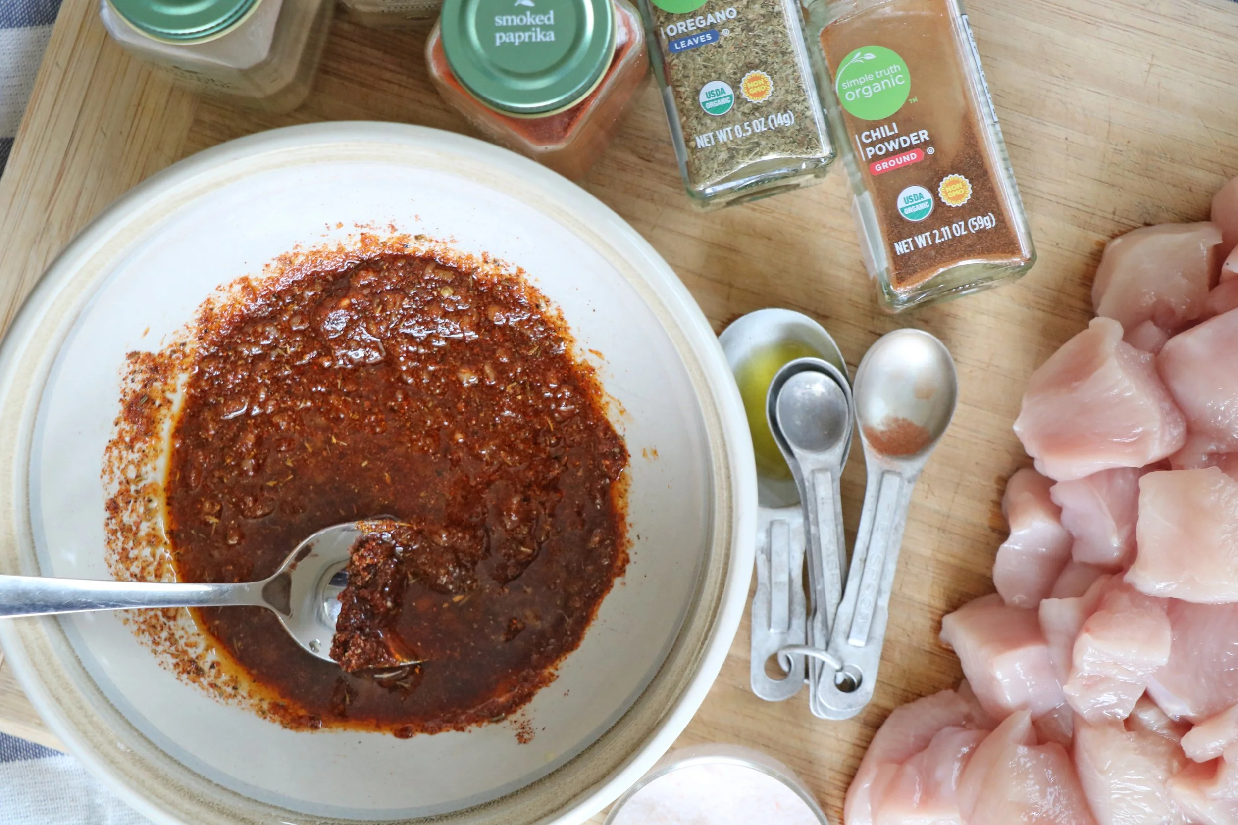 What I mainly wanted to share in publishing this favorite recipe is the way I prep and season the chicken. it’s a little bit of a game changer. I start by measuring all the spices into a medium bowl and mix them together. Then I add the olive oil to make a paste. Finally, I add the diced chicken and toss to coat. For me, this method of seasoning the chicken, as opposed to shaking on dry spices, ensures the chicken is thoroughly coated in a thick and even layer of the spice blend. I use this seasoning method for diced chicken breast, but also whenever I sauté or grill a whole chicken breast or thigh.